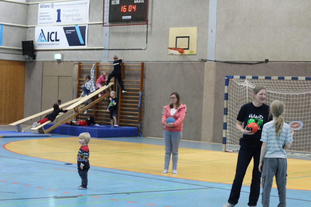 In der Sporthalle wimmelte es nur so von bewegungsfreudigen Kindern, die die liebevoll aufgebaute Bewegungslandschaft sowie die zahlreichen Materialien aus der vereinseigenen Spieletonne begeistert nutzten.